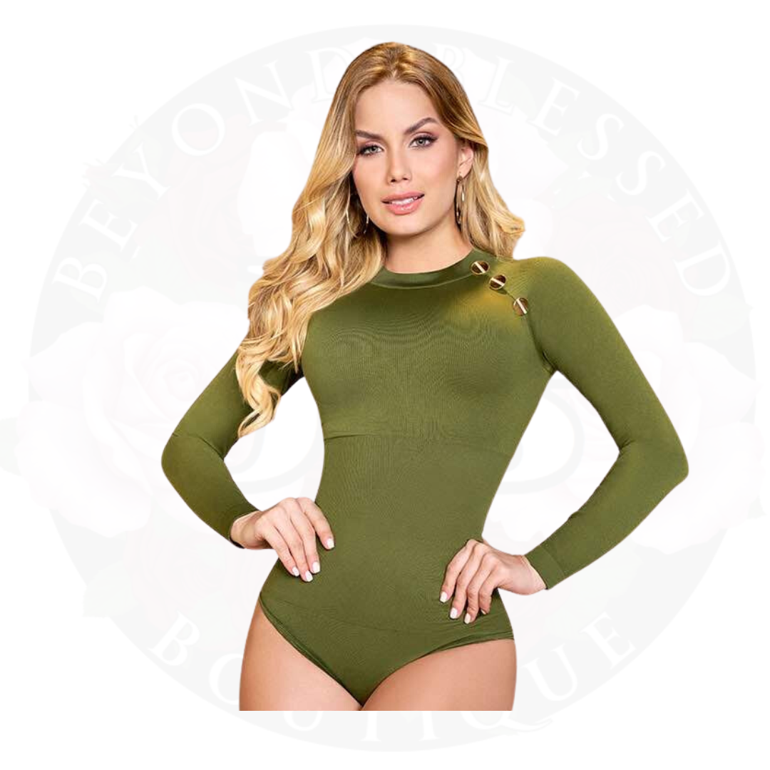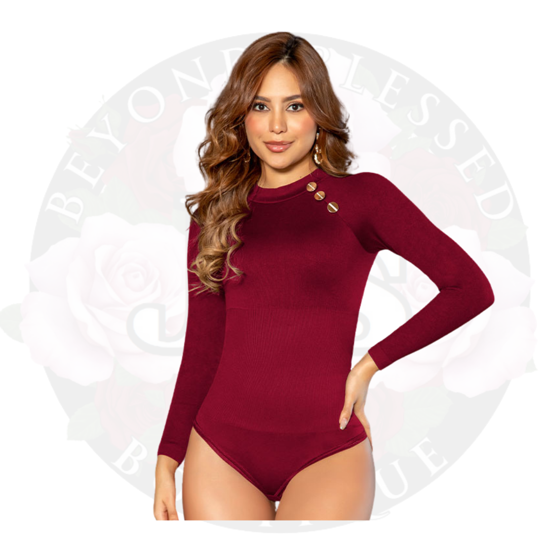 Thong-type bodysuit with abdomen control and waist control. High collar with golden buttons on the left side with seamless technology, adjustable lower clasp facilitates use of restroom.