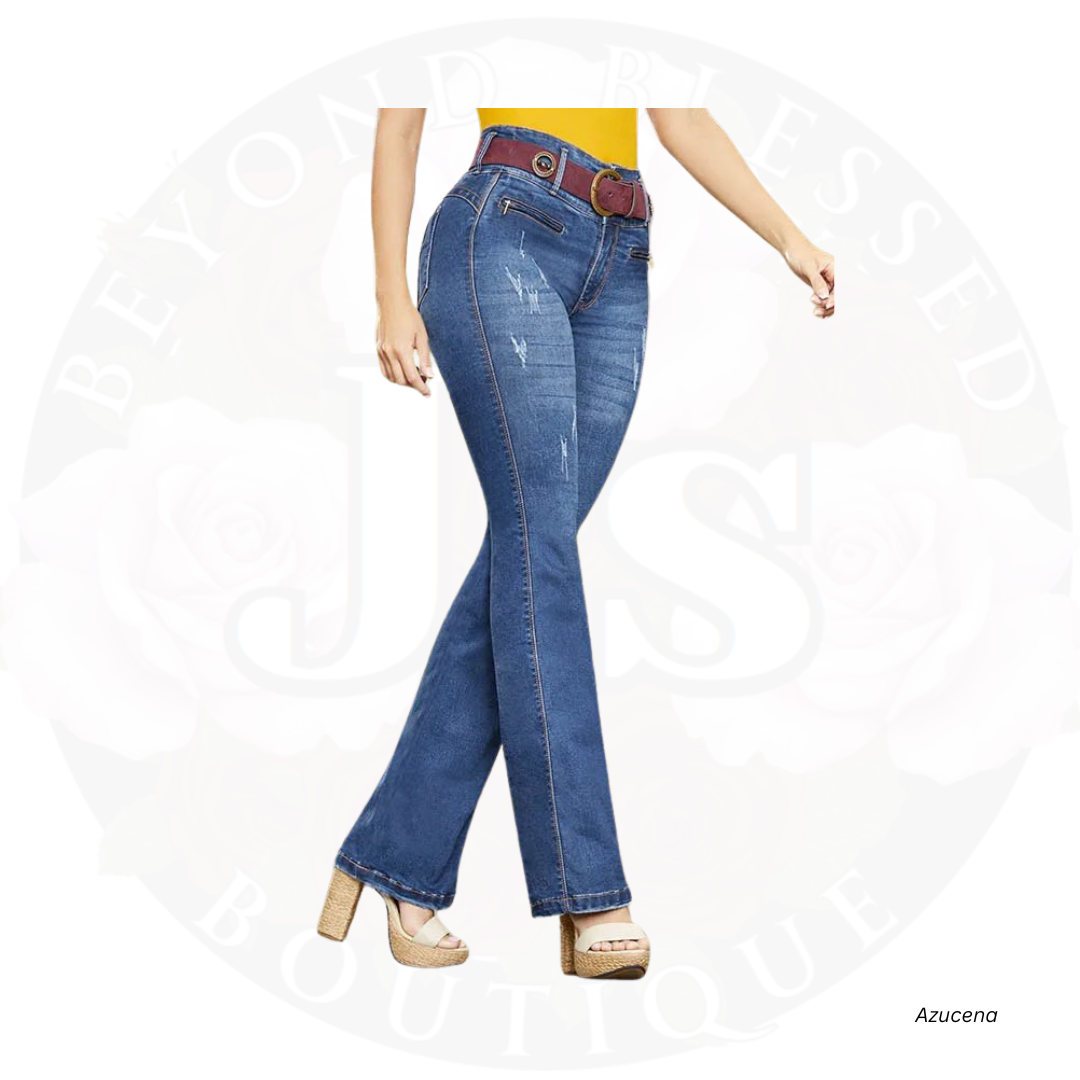 Enhance your curves with Jean Azucena's butt-lifting jeans. Made from soft-touch peach skin fabric, these jeans feature a three-button, high, anatomical waistband for a comfortable and flattering fit. With back pockets and a wide-leg design, these jeans will shape your legs and hips for a confident look.