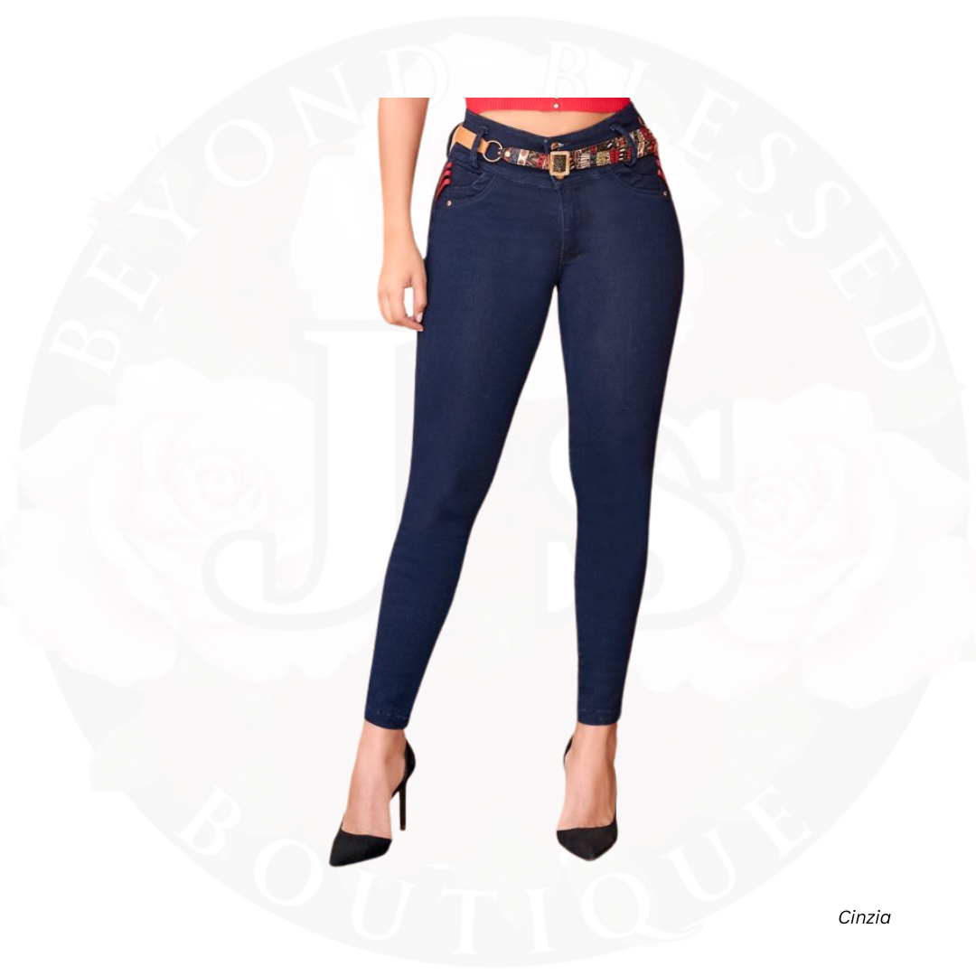 Transform your curves with Jean Cinzia. Crafted from soft-touch peach skin fabric, these butt-lifting jeans sculpt your leg and hips for a sleek silhouette. The three-button high waistband and anatomical waistband provide a secure fit, and the back pockets and included belt add functional details.
