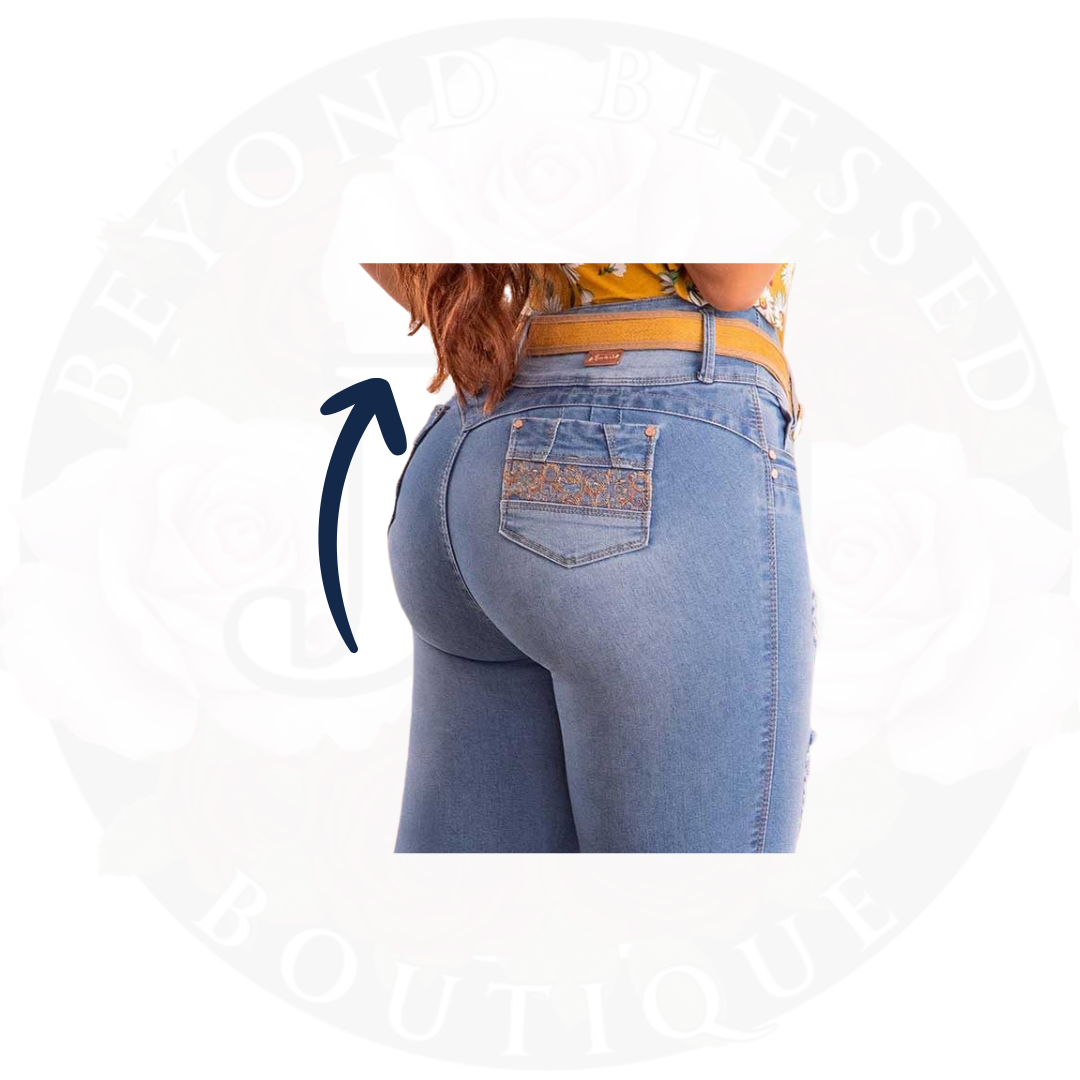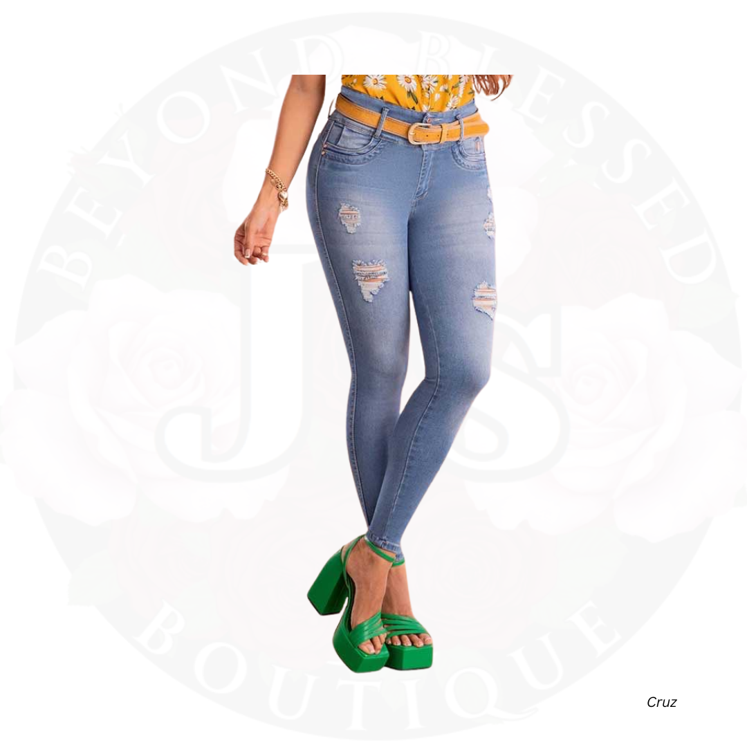 Jean Cruz's butt-lifting jeans are crafted from soft-touch peach skin fabric, offering a comfortable and flattering fit. With a three-button high and anatomical waistband, these jeans shape and enhance your legs and hips while providing a secure fit. The back pockets feature intricate embroidery, adding a touch of style. Plus, they come with a belt for added convenience.