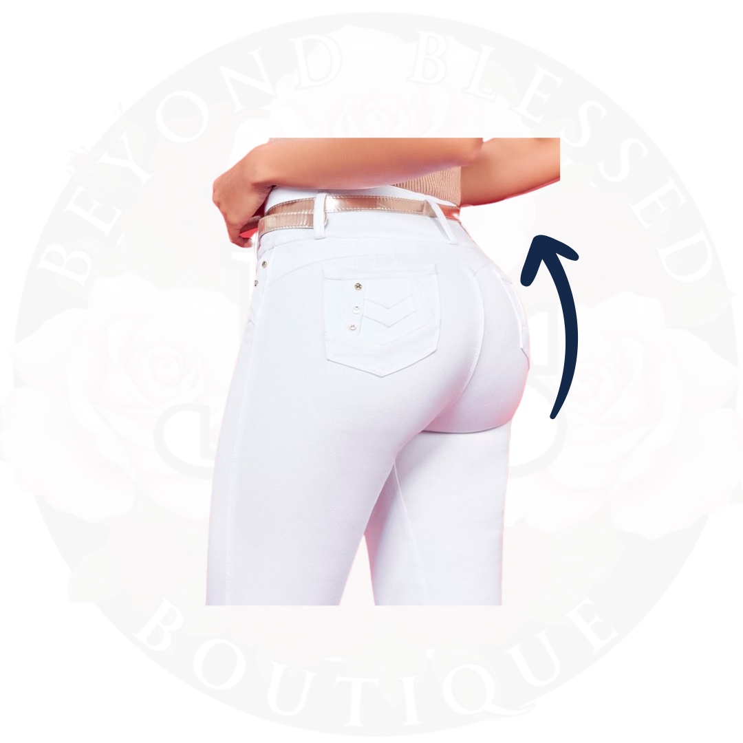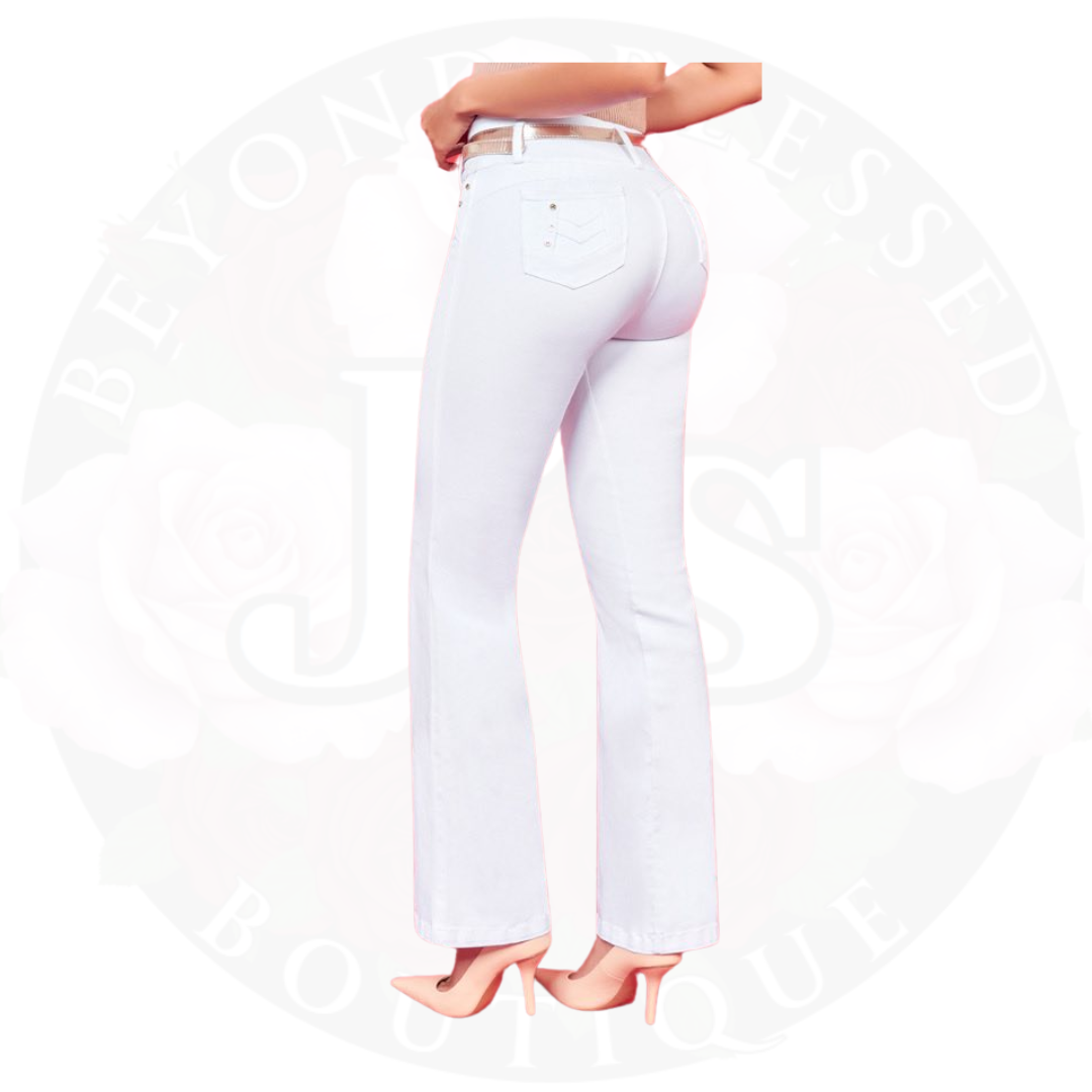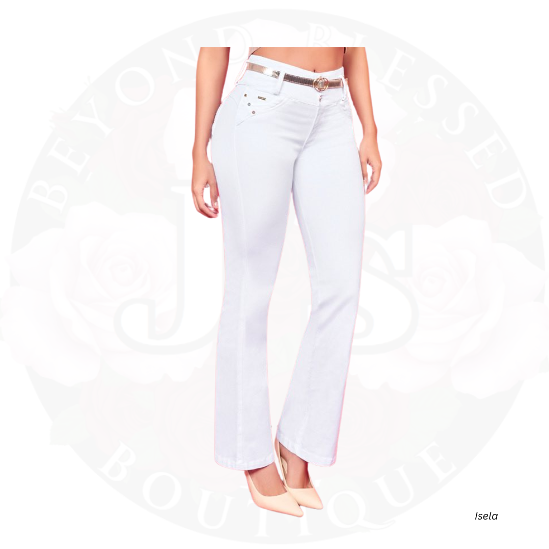 Upgrade your denim game with Jean Isela. Made from soft-touch peach skin fabric, these butt-lifting jeans feature a three-button high waistband and anatomical fit. Designed to shape the leg and hips, the wide leg and back pockets add extra style and functionality. Complete the look with the included belt.