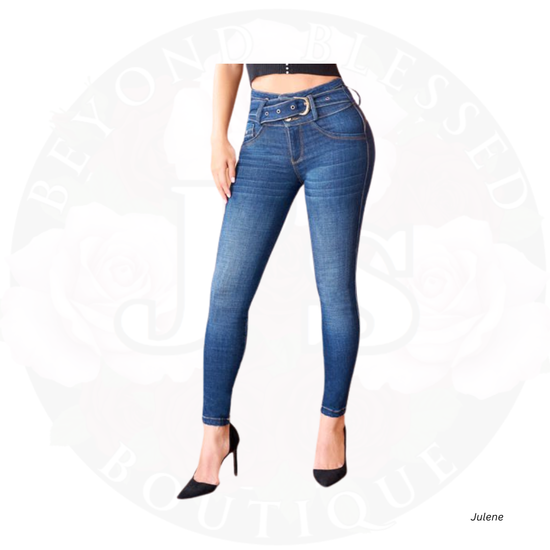 Improve your figure with Jean Julene's butt-lifting jeans. Made from soft-touch peach skin fabric, this pair features a three-button high waistband and anatomical waistband for a comfortable and flattering fit. The back pockets, belt, and shaping design enhance your leg and hip, making you look and feel confident.
