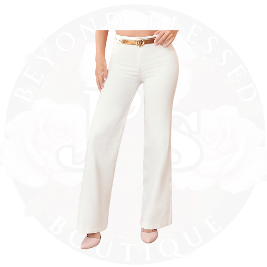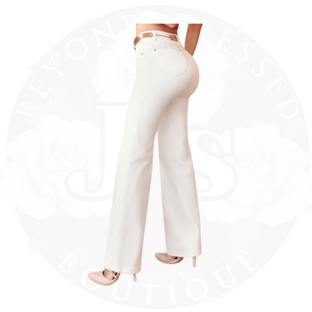 This expertly designed Jean Llucia, is made of soft-touch peach skin fabric and features a butt lifter to provide comfortable support. It also includes a single-button waistband and anatomical waistband for a perfect fit. The wide leg design contours the legs and hips, while the back pockets and included belt add practicality and style.