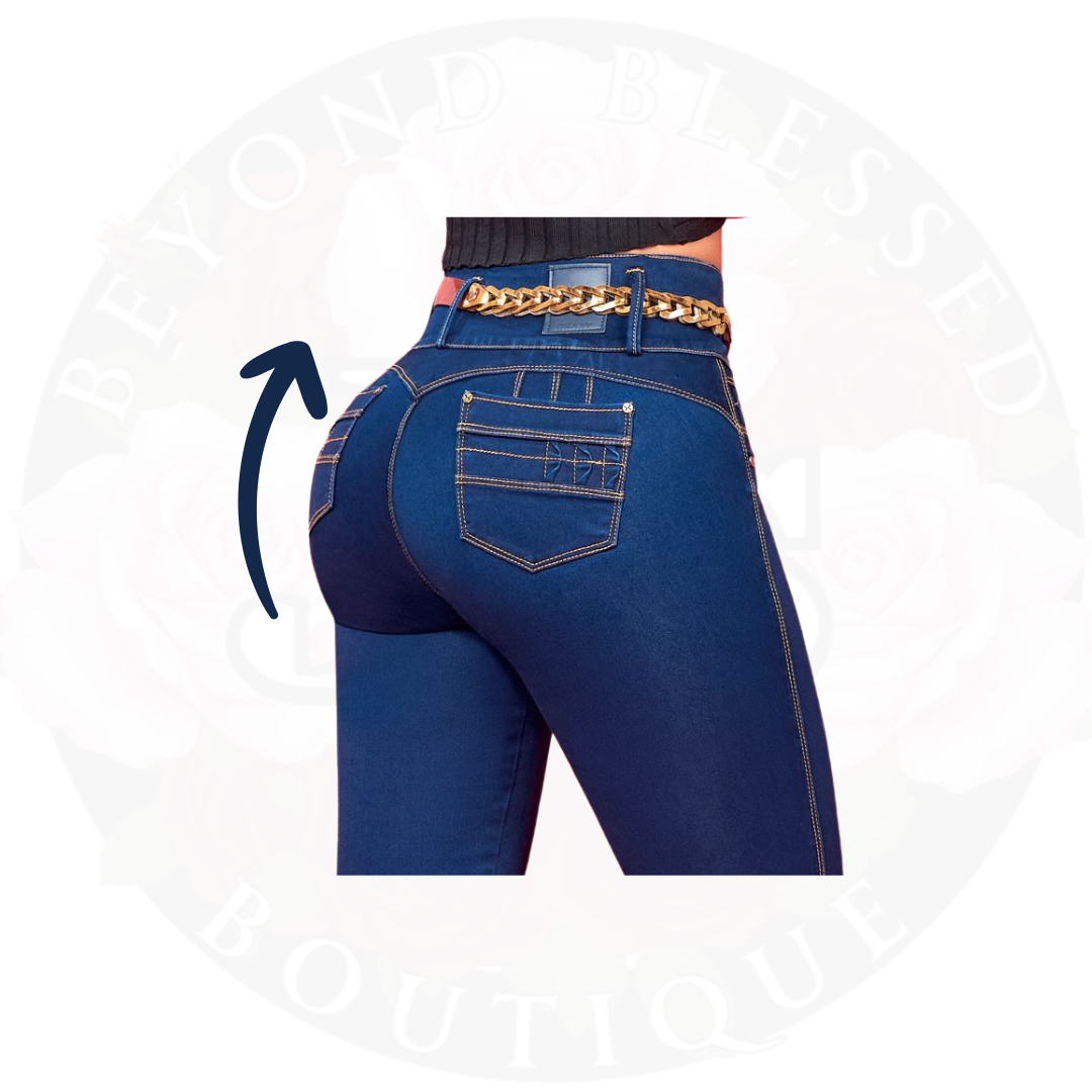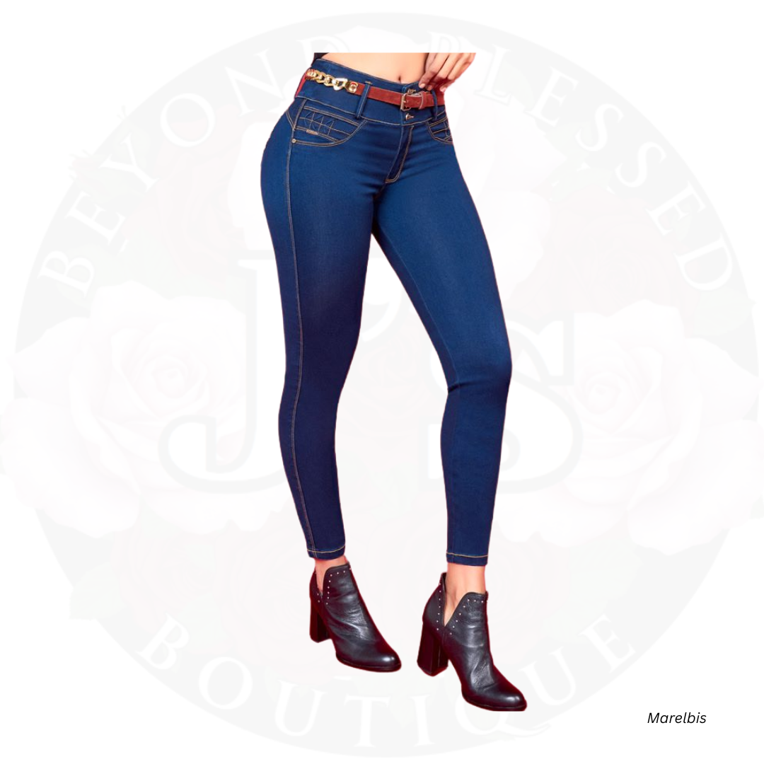 Experience the ultimate in comfort and style with Jean Marelbis. Crafted from soft-touch peach skin fabric, these butt-lifting jeans feature a three-button high waistband and anatomical waistband for a flattering fit. With back pockets and a belt included, these jeans shape your legs and hips and elevate your fashion game.